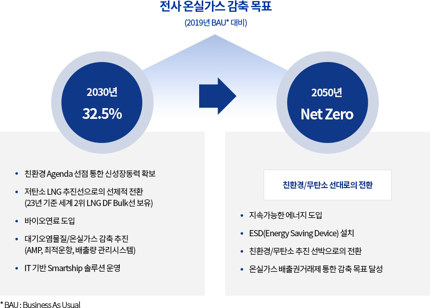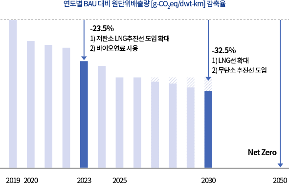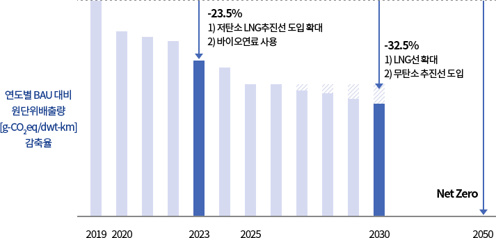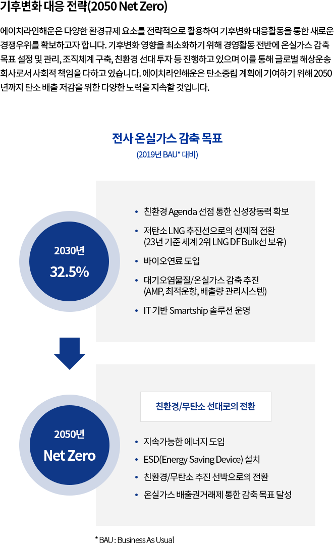 에이치라인해운은 다양한 환경규제 요소를 전략적으로 활용하여 기후변화 대응활동을 통한 새로운 경쟁우위를 확보하고자 합니다. 기후변화 영향을 최소화하기 위해 경영활동 전반에 온실가스 감축 목표 설정 및 관리, 조직체계 구축, 친환경 선박 투자 등 진행하고 있으며 이를 통해 글로벌 해상운송회사로서 사회적 책임을 다하고 있습니다. 에이치라인해운은 탄소중립 계획에 기여하기 위해 2050년까지 탄소 배출 저감을 위한 다양한 노력을 지속할 것입니다.